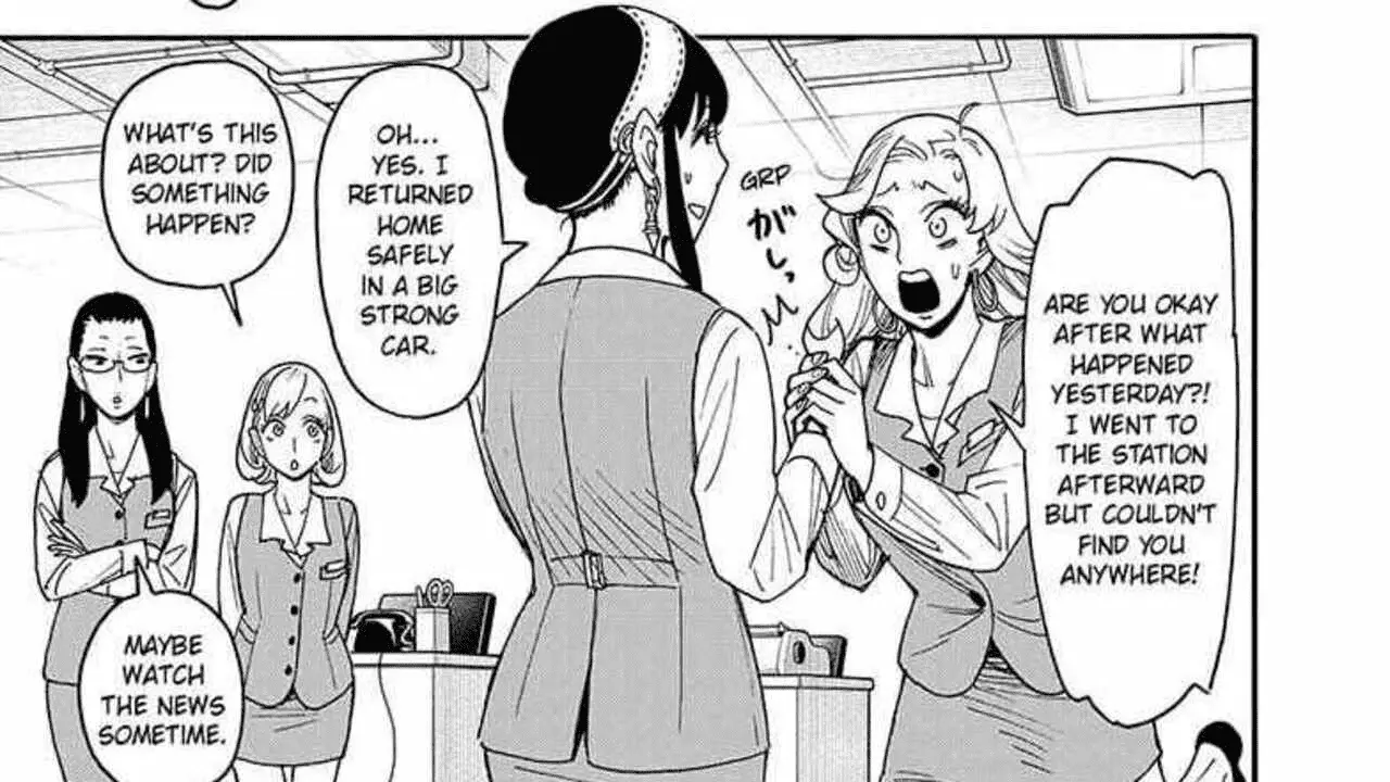 The chapter begins with a news anchor on TV announcing that the Minister of Broadcasting has been replaced by Coryn Will after what happened at the TV station involving the terrorists. Yor’s co-worker Camilla holds her hand and asks if she’s okay, and why she couldn't find Yor at the station when she visited. Yor tells her she is fine and that she left the station early in a big car. Camilla, Millie, and Sharon talk to Yor about what happened and ask if she’ll continue acting, to which Yor says no. Suddenly, Hemlock, who has been working as Mr. Jones at Berlint City Hall with Yor, enters the room and expresses his displeasure.