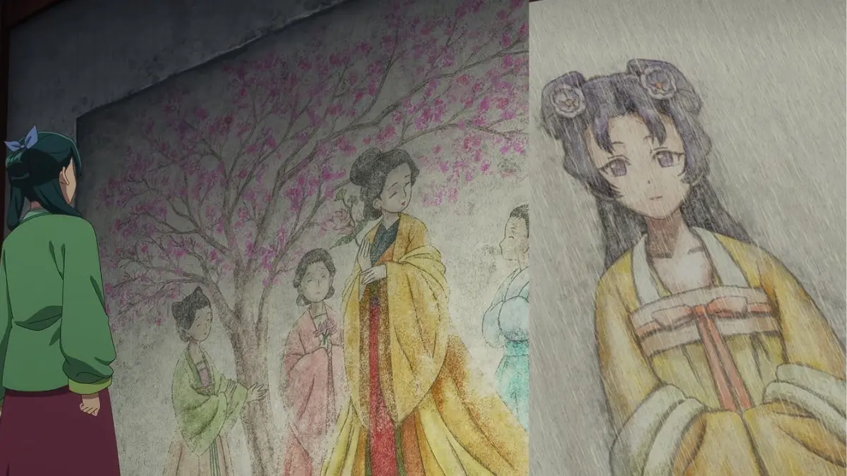 The following morning, upon arriving at the emperor’s chambers, Maomao immediately notices a distinct scent. She summons the caretaker who remained by the Emperor Regnant’s side during his final years. Eventually, Maomao uncovers layers of wallpaper and reveals a hidden painting—one that depicts a woman in yellow surrounded by young girls, seemingly pre-adolescent.