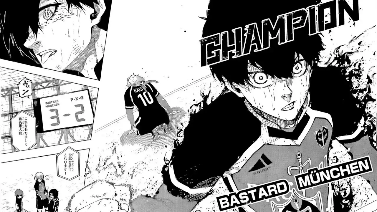 Bastard München players start to celebrate after Yoichi Isagi scores the winning goal, making them league champions in the latest chapter of Muneyuki Kaneshiro’s manga. PXG players are heartbroken for the loss. But the person who seems to be hurting the most is Kaiser as he couldn’t predict Ness’ pass while Isagi did. It’s announced that the final salary rankings will be revealed and we see the faces of two beloved players.