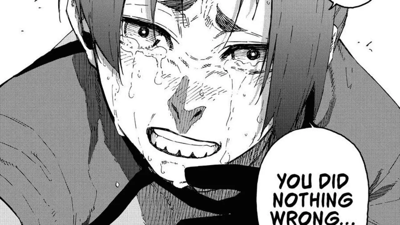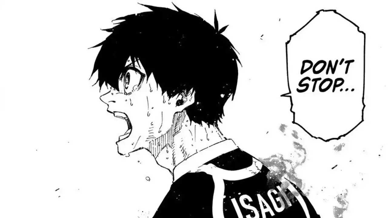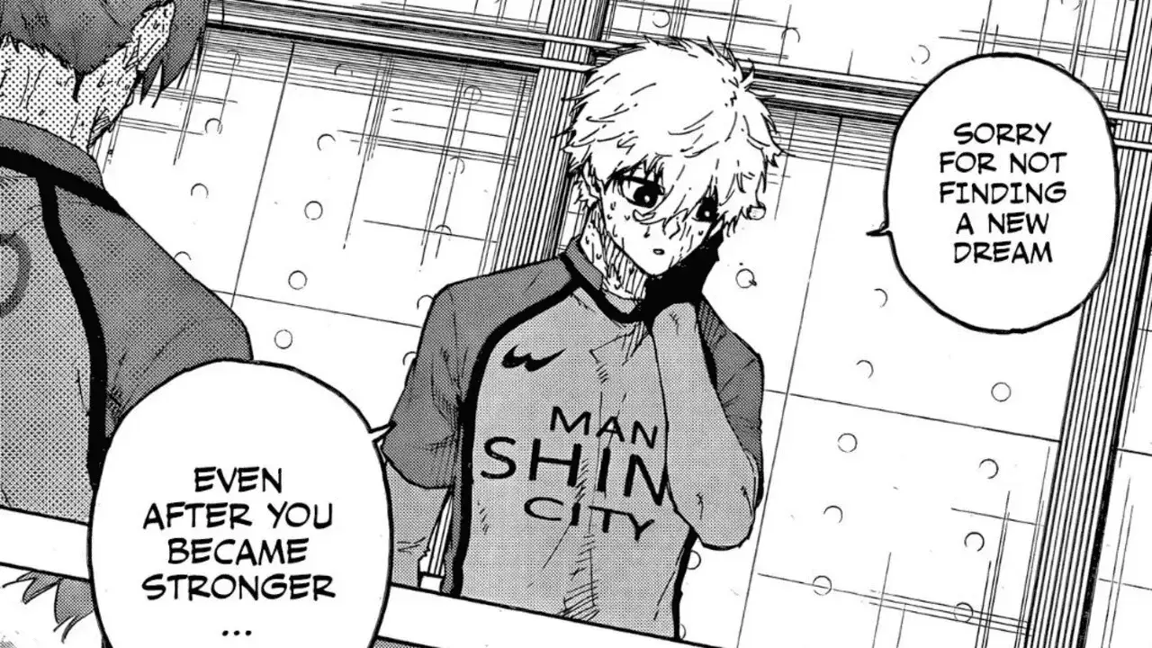 Nagi calls Reo’s name and says that he has no regrets. Looking at Reo’s crying face, he continues that Ego was right. He was satisfied with winning against Isagi and playing football with Reo forever. Unfortunately, his dream was too small to survive in Blue Lock, where everyone is playing to become the best in the world. Maybe if he lost against Isagi and got angry, and maybe if Reo didn’t spoil him, the future would’ve been different. He says sorry to Reo for wanting to play with him instead of becoming the world’s best. He also apologises for not finding a new dream, for passing to Reo and not shooting on his own, and for failing to keep their promise.
