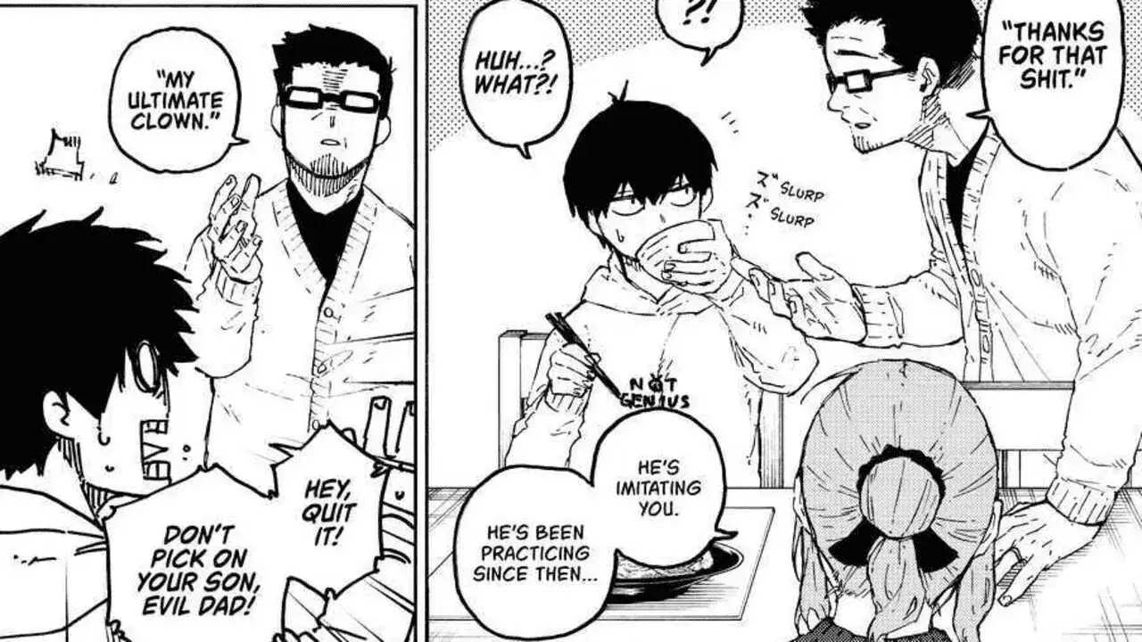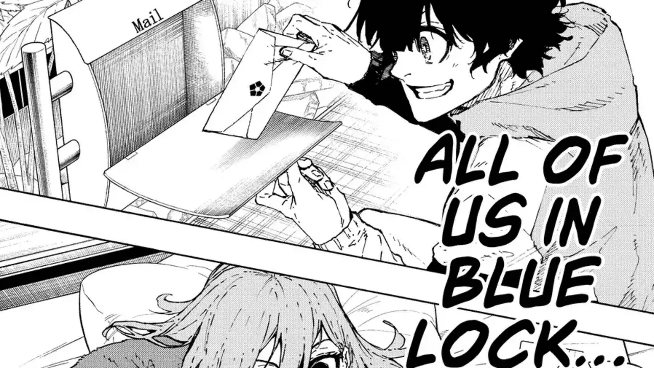 The chapter begins with Isagi eating dinner with his mother and father. The two of them praise him and his father urges him to eat the celebratory pork cutlets his mother made. He says that he’s visiting because there is still some time before the U-20 World Cup. His father praises his achievements and Isagi reveals that Blue Lock will take care of the overseas offers. He also thanks his parents and says that he’s happy after becoming the No. 1 player at Blue Lock. His father then jokingly mocks him by using some of the foul language Isagi uses during games, which embarrasses him. A deliveryman hands over a box from Blue Lock to Isagi.
