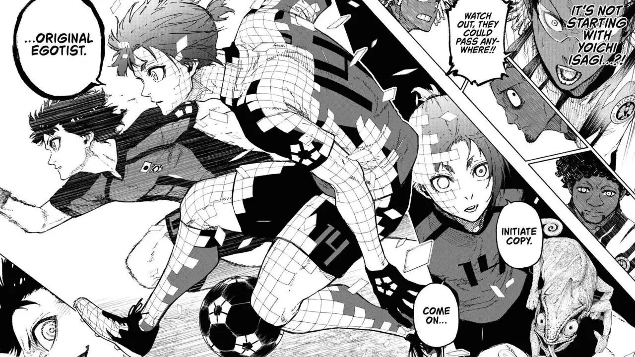 He runs away with the ball and Kuso tells his teammates to not let him get it to Isagi. Realising some of his paths are blocked, Niko shoots it straight to Reo in an impressive pass. The Nigerian players are shocked to see that Japan’s counter play doesn’t start with Isagi this time. Although they try to be careful, Reo initiates his copy technique to follow Bachira’s moves exactly. The real Bachira catches up to Reo in time the copy is complete. In the end, it seems like two dribbling monsters are heading down towards the Nigerian goalpost together, leaving everyone in awe.