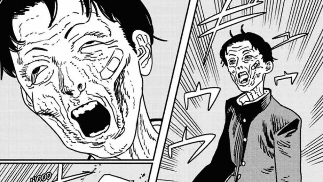 Suddenly, the boy feels a tug on his pants and looks down to see the dismembered hand of the crybaby girl holding onto his leg. The off-brand Chainsaw Devil tries to warn him, but within seconds, all the life force is sucked out of his body. The boy falls to the ground with his entire body aged and shriveled up while the whiny girl restores all her limbs and stands up. After judging his stance and fighting style, the devil girl deduces that she can take down Chainsaw Man in three seconds. They start fighting again, and within roughly three seconds, fake Chainsaw Man cuts her into pieces once more. Her severed head starts crying and asking for help while the other devil wonders how she’s so weak.