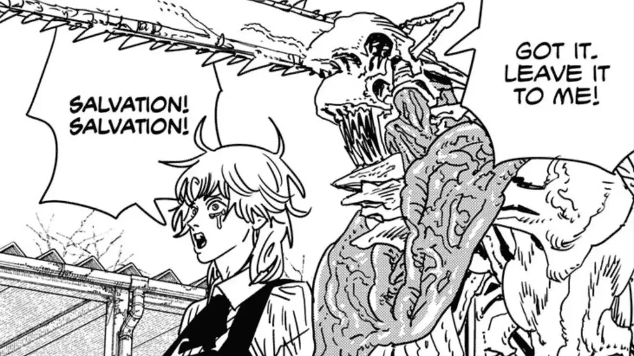Falling asks if it’s necessary for Death to eat people, as they’ll be enslaved to her after she kills them anyway. Death says that fresh meat tastes great and it’s good manners to savour and honour their lives like this. She then drops the dolls on the ground and calls forth the Famine Devil and the Fake Chainsaw Devil. The replicas start to grow and reach full size within seconds. Famine tries to punch Death for eating her and is confused about how they're alive. But Death orders the two of them to “Plunge mankind into an abyss of terror”. Surprisingly, the two immediately agree to follow her order with Famine, yelling “Salvation” over and over again.