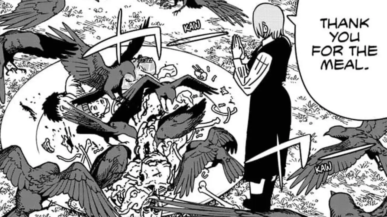 However, it doesn’t seem that Death Devil is a big fan of this idea. She says that she has a plan, and if Fami and Fake Chainsaw Man assist her, mankind might not be annihilated. They enthusiastically agree and offer to help, but Death says that it’s not necessary since she’s going to eat them. Before they can react to it, the Falling Devil points a knife at them, causing them to scream in pain. Soon, a murder of crows attack the two, and within minutes, their bodies are consumed. The Falling Devil asks how it tastes and Death says that it wasn’t tasty. She then reaches her hand inside her mouth and pulls out two doll-sized replicas of Famine and Fake Chainsaw Man.