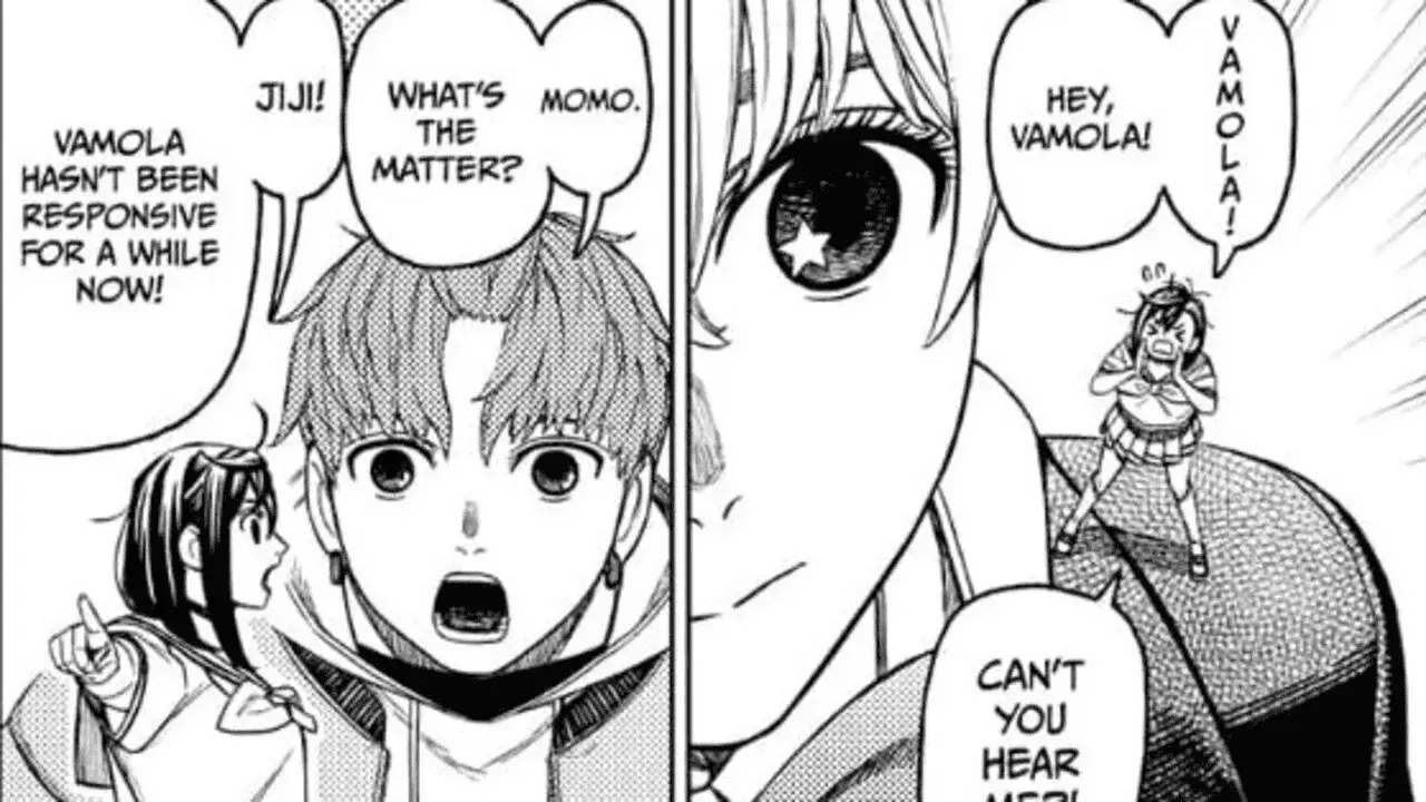 The scene moves to the station where Momo, Seiko, Jiji, Unji, and Vamola are. Seiko asks Majiro to take care of everything while she’s gone. He in turn, reminds her to keep taking painkillers since she has broken ribs. Momo, who’s standing on Vamola’s shoulder, calls her name to get her attention, but it seems that Vamola can’t hear her. Jiji asks Momo what’s going on. She says that Vamola hasn’t been paying attention to her for a while, as if she can’t see her at all. Momo thinks that the curse which made her tiny is progressing rapidly. Soon, she will be forgotten like the pygmies, and nobody will be able to see her anymore. The final panel of the chapter shows Aira, Rin, and Kouki coming out to meet Okarun and Kinta. Aira hugs Okarun when she sees him.