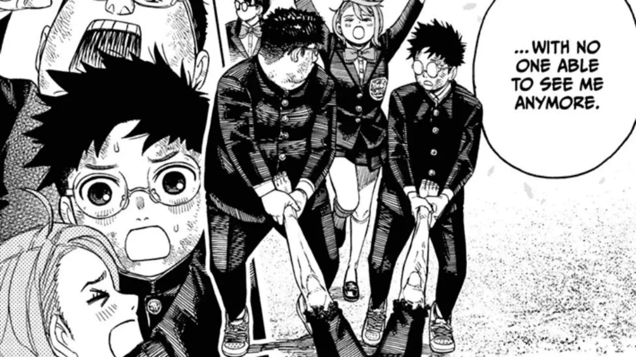 The issue opens with Miss Adachi at the riverbank under an overpass. We learn that she has obtained a power and is set to hand it off to the person she’s working for. When she reaches their agreed upon meeting place, she sees a tall and creepy man standing there, extending his left hand to her. Suddenly, her phone buzzes, and when she picks it up, a voice compliments her hard work. She informs them that she has a new power, but the voice tells her that Takeshi Murakami, the person she took the power from, was also working for them. She is shocked and asks how that could be. The voice says that Murakami was also tasked with collecting powers like her. However, her target was already specified, and she had no reason to go after Murakami instead.