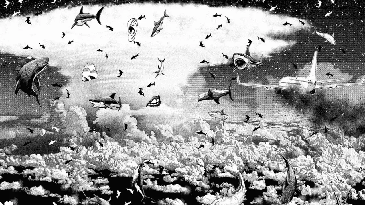 The woman says that she thought they would have exorcised the yokai by now, and is surprised that Jiji still has him. She tries to attack him again and Zuma’s umbrellas try stopping her. As she asks him to let the Evil Eye out, the Kito woman is confronted by Seiko. Momo tells them to go back to jail. The family accuses them of destroying their lives and getting them arrested for no reason. Momo retorts, but the plane starts shaking violently. Jiji looks out the window and sees that one of the engines has been blown away. Momo asks how it’s even possible. Jiji then sees that there are massive sharks flying in the sky around their plane. There is also a giant nose, ear, and mouth in the air.