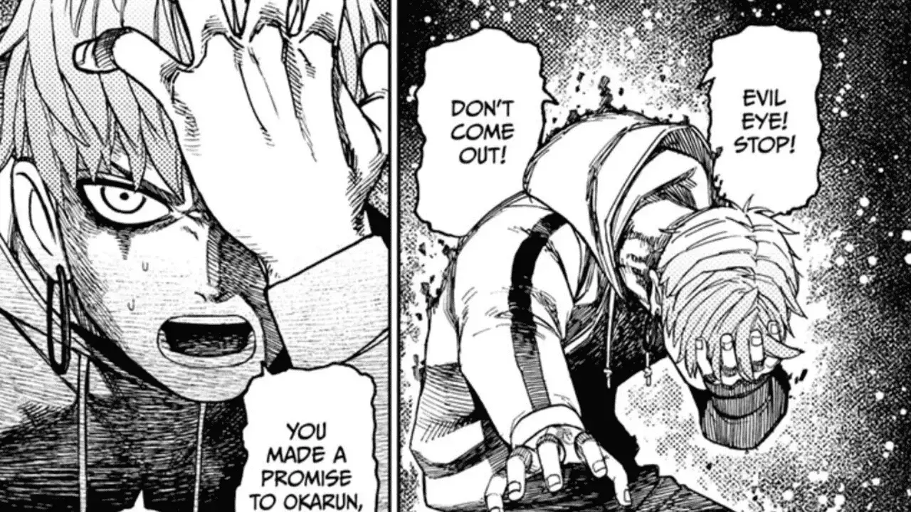 One of the Kito men hits Seiya in the face and is stopped by Zuma. He turns around and hits Zuma in the face, taunting him for sitting while his friends are fighting. Seiya tries to stop him by saying that Zuma is blind, but another man kicks him in the chest. Zuma finds the head of the man hitting him and punches him in the face, throwing him off balance. He also headbutts the man hitting Seiya, but Vamola reminds him to get back to his seat. The woman and another man attack Jiji. She tells him that they’re going to make sure he feels the hate of the people they killed. Suddenly, Jiji lands a massive punch on the man’s face, throwing him back. We see that the word ‘hate’ has triggered Evil Eye and he wants to come out. Jiji reminds him of his promise to Okarun and tells him not to kill anyone.