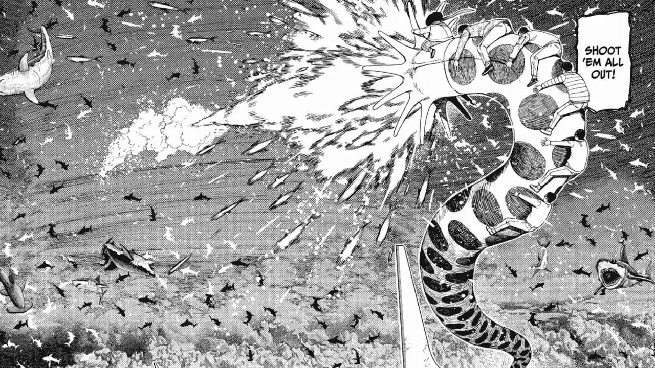Just when I think that the Dandadan manga can’t get any crazier, Yukinobu Tatsu comes up with a chapter to completely blow me away. In the latest issue, Seiko tells Momo and Jiji to work together and throw the frozen sharks at the center of the typhoon to hopefully cool its temperature and stop it from tearing the plane apart. Shockingly, the Kito family joins their venture. But what Naki Kito pulls out from her bag shouldn’t be in anyone’s luggage.