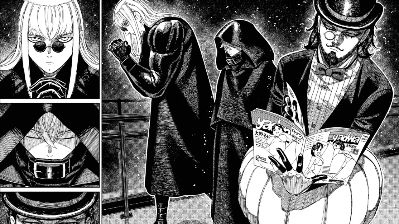 The issue begins with revealing the three men standing in front of Rin and Kouki. One of them is Enenra, the smoke yokai Jiji fought before. Between the other two, one is a monocled man with a top hat who’s seen reading an adult magazine. The other is a long-haired man with a bald spot, who has really muscular arms and wears tiny sunglasses. The monocled person is seen wearing a carved pumpkin around his waist. He turns around and seemingly farts a cloud through the pumpkin’s face. He then turns back to flick something into the smoke which turns it into lethal fire flames.