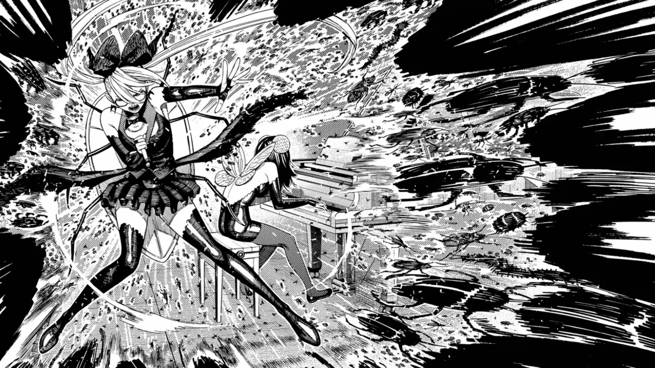 Before the next attack, Kouki starts playing with all her might. Rin uses her shell to cover both of them as the flames engulf their surroundings. But Kouki doesn’t stop playing and her eyes take on a new glitter. From the smoke emerges millions of cockroaches. In the final panel, we see that Rin’s idol outfit has transformed into a cockroach-like attire, and Kouki’s new clothes resemble a fly.