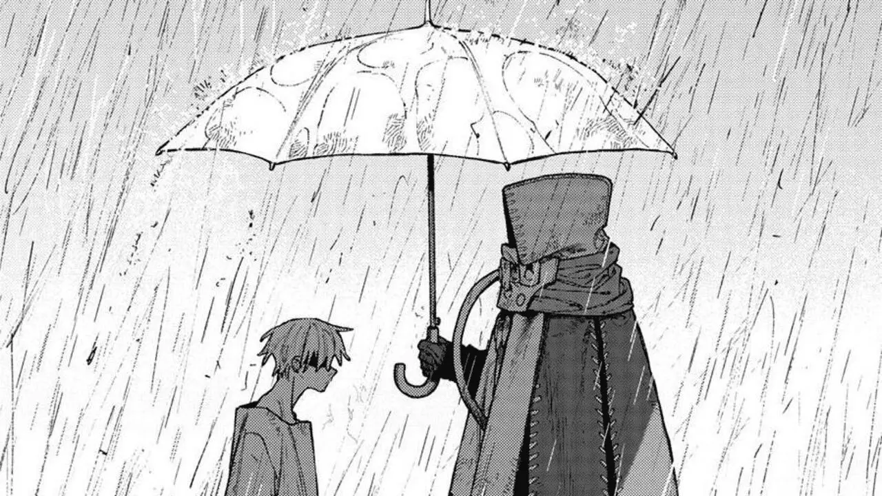 The chapter begins with showing a lanky boy standing in the rain, while a man in full gear stands next to him and holds an umbrella over his head. A massive trash beast can be seen in the background. The man takes the boy into a cave and offers him some water. The boy says that he won’t get much money if he is sold. He then tells the man to make sure that he is given a decent name, if the man sells him. The man asks what his name is now, and the boy spells out a really long and complicated multi-part name, saying his parents and the following orphanages all tacked names onto him without thought, like adding parts to a modded car.