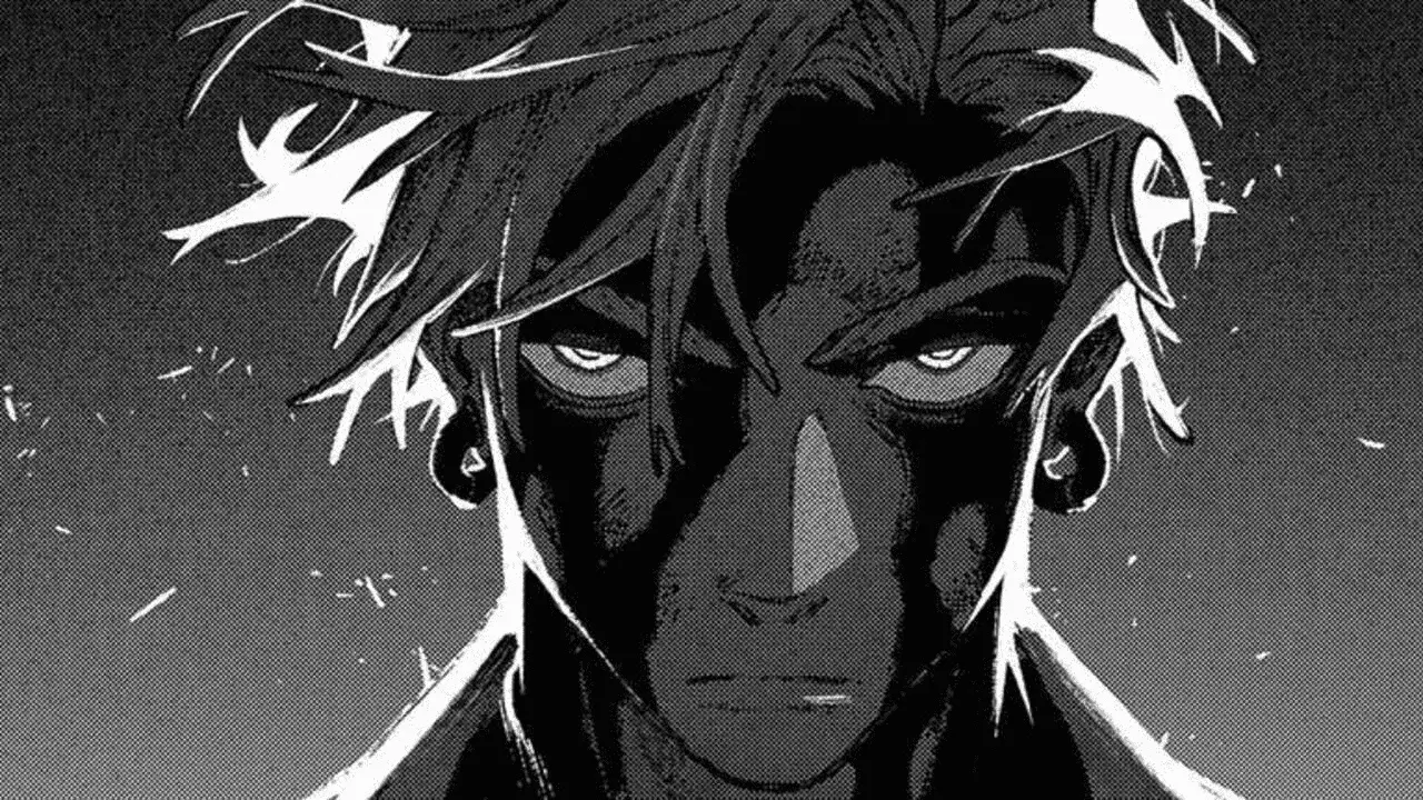 As they’re about to leave, Alto hands Enjin an umbrella since his hands are full. The boy holds the umbrella over their head as the two ride out into the rain on horseback. The next panel shows us the present, where Enjin’s dark silhouette, along with his Vital Instrument Umbreaker enters the garage where Rudo, Mymo, and Gountess are. His serious and cold face dripping with blood, Enjin enters the battlefield.