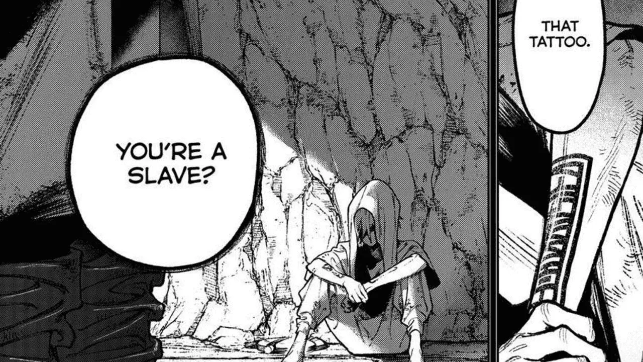 The man tells the boy to pick his own name if he doesn’t like it, and the boy says it’s too much hassle. Noticing the tattoos on his arm, the man asks if he’s a slave. But he realises that based on what the boy said earlier, he probably ran away before anyone could sell him as a slave. We learn that there’s an orphanage that brands the kids in their care, so they could sell them at a decent price when they’re older. The institution has currently become a slave market. The young boy says it’s his fault. He ran away because his housemates were too loud and found someone who looked like he had money and talked to him. After that, the man changed the orphanage into a slave market. The boy is tired of running with this guilt.
