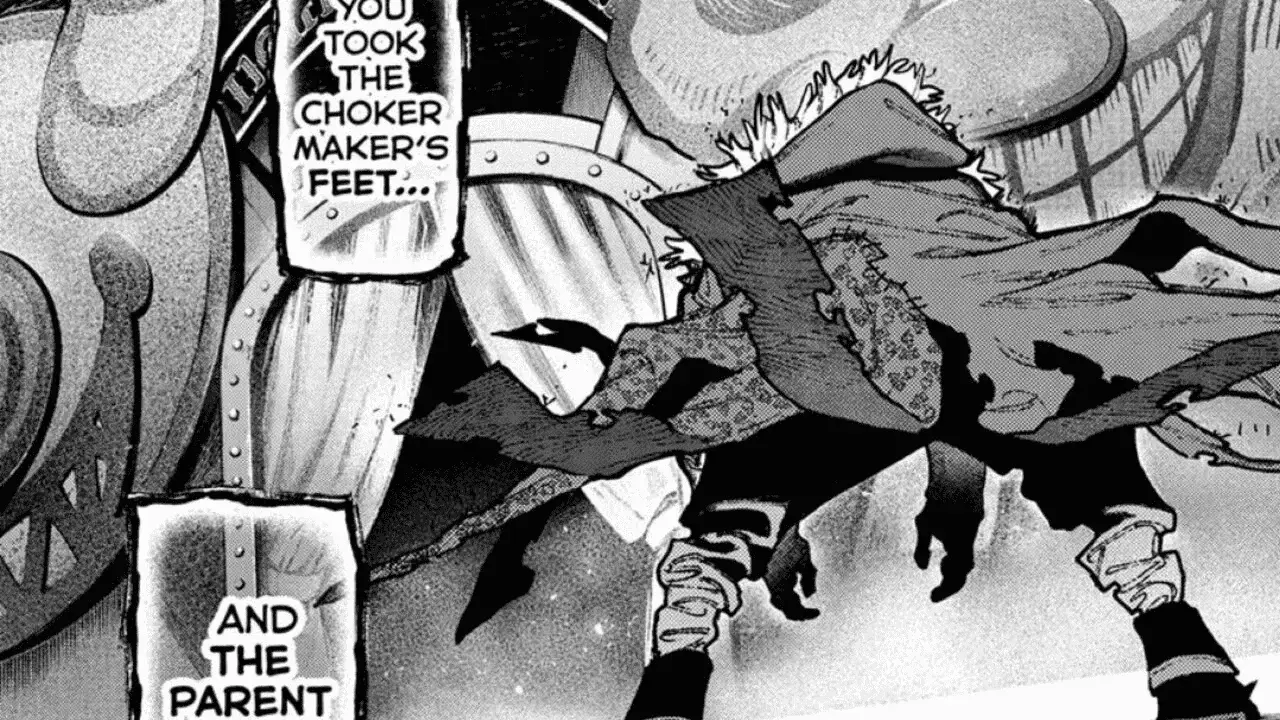 The man again asks why Enjin would say such a thing, and Rudo says that the Information Broker warned them that someone was listening in on the chokers. Suddenly, Enjin grabs Rudo’s shoulder and says that he didn’t expect his prize to be the person they were looking for. Then he addresses the Choker Maker and orders him to tell him everything. Right after, Mymo asks everyone to stop spinning and calls the ‘Spherite’ Rudo Surebec onto the stage. A person descends onto the stage, but before Mymo can do anything, he hits the New Reporter with an umbrella. We realise that Enjin entered the stage as Rudo follows right behind him. He yells at Mymo, calling his dream of becoming a ruler ‘garbage’ and asks how dare he take the Choker Maker’s feet and his parents to realise this messed up dream.
