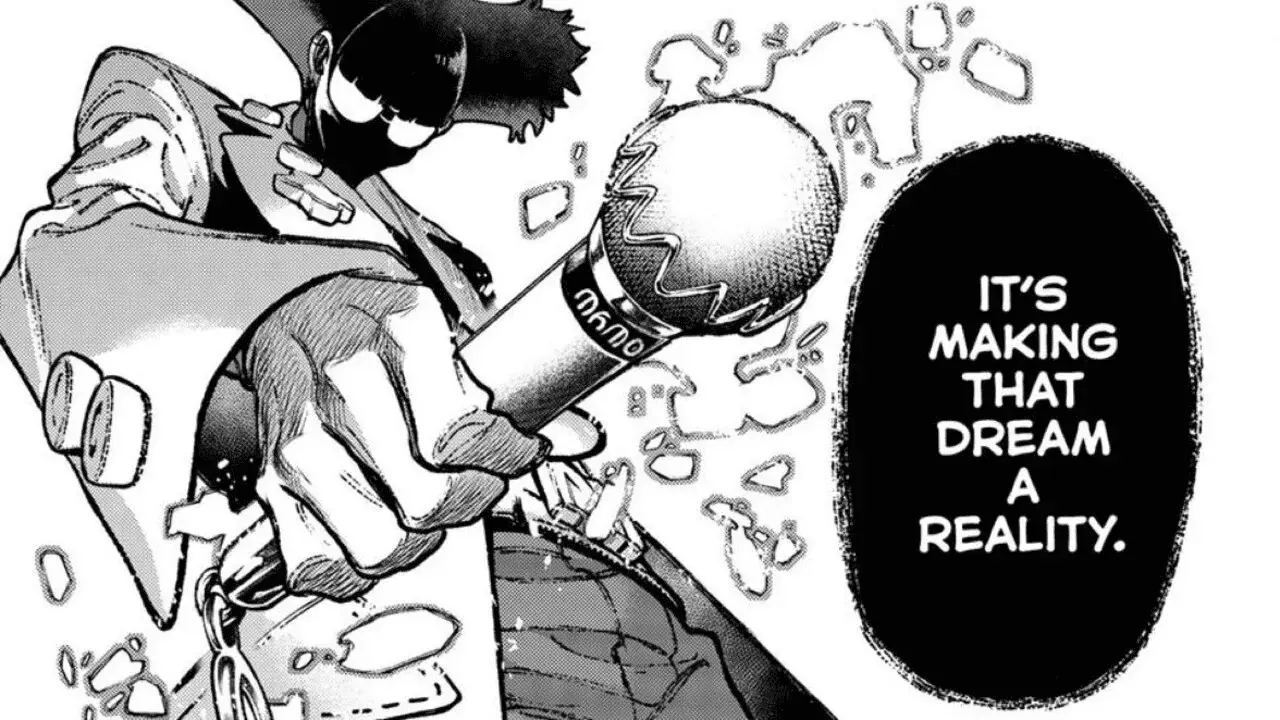 Mymo figures out that he can’t control the Cleaners through their Chokers, and realises that it might have been Too Lily’s gift to Rudo. He says that the Countess has been naught and that children are to behave themselves when a parent isn’t home. He then says that he killed the parent. Enjin says that unlike Rudo, he doesn’t get angry on others’ behalf, but Mymo’s dream of becoming the ‘Ruler’ is indeed embarrassing. He confiscates Mymo’s vital instrument, the microphone. But suddenly, someone attacks him from above, causing the mic to fall from his hand. Mymo catches it and says that no matter how cringe and embarrassing people think his dream is, the thing that matters is making the dream into a reality.