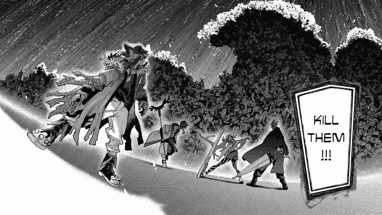 Finally, he turns to Rudo and says that he’s a dunce who can’t even go back to the Sphere and avenge his father’s death. This makes Rudo angry, and he tries to attack Mymo. But Felix stops him with a shield created with his Vital Instrument. Mymo says that he has worked tirelessly to become the ruler, which was his dream, and people who can’t make their dreams into reality can’t lecture him. He then turns on his Vital Instrument Elenhos and orders the entire arena full of people to kill Rudo, Enjin, Zanka, and Riyo. The final panel shows the four Cleaners standing on the stage as the massive crowd of people form a wave to attack them.