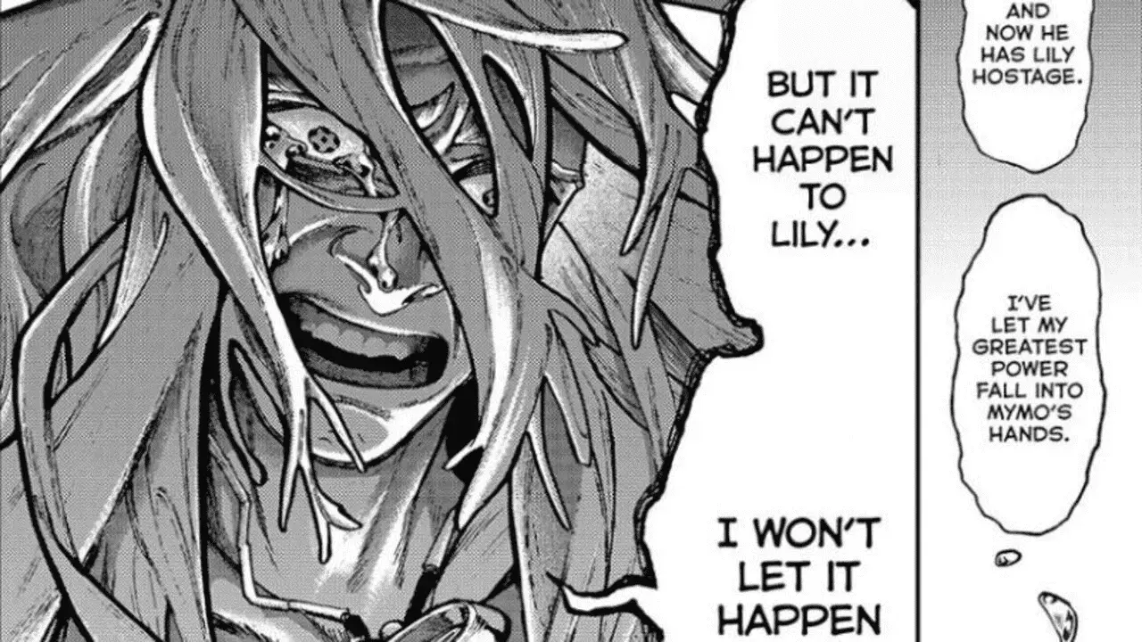 In a terrifying panel, we see how Mymo cut off the heads of Gountess’ grandparents and presented them to him on plates. The horrific memory still lives in Gountess’ mind. Now, the psychopath has Lily hostage, and he can’t stand to see her suffer the same fate as his family. He begs Rudo to protect Lily. He reveals that although her Vital Instrument lets her do almost anything, there is a massive caveat. Lily can never use her power to hurt anyone or she will die. No matter how cruel Mymo is to her, she can’t harm him.