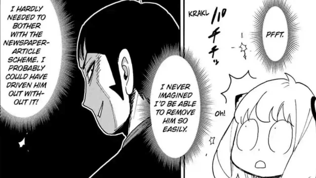 Later, we see another teacher taking Henderson’s class that Anya, Betty, Damian, and the others attend. They also overhear students talking about how their Cecile Hall students must be cheating to get good marks since Henderson is their Hall Master. Anya rips off one of the news reports from the notice board and takes it to her father. Loid already knew about it, but he tells Anya that a single piece of paper isn’t enough proof. In his mind, he thinks how hard it would be to disprove the article and asks Anya what she thinks. She says that she doesn’t know but she wants to ask and find out. Loid wonders if the Ministry of Education and the SSS will crack down on Eden Academy soon. He also thinks the allegation against Henderson might be true.