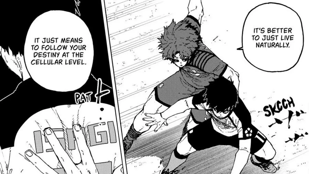 Hugo creeps up behind Isagi again, and tells him each being has a suitable way of life. Horses can run fast and birds can fly, but humans are the only ones that try to break away from their nature. Someone without aptitude can never defeat someone who was born with it, If every human being played to their strengths and lived their lives in accordance with what they’re suitable for, the world would be happier and more efficient. Following your destiny at a cellular level is Hugo’s philosophy.