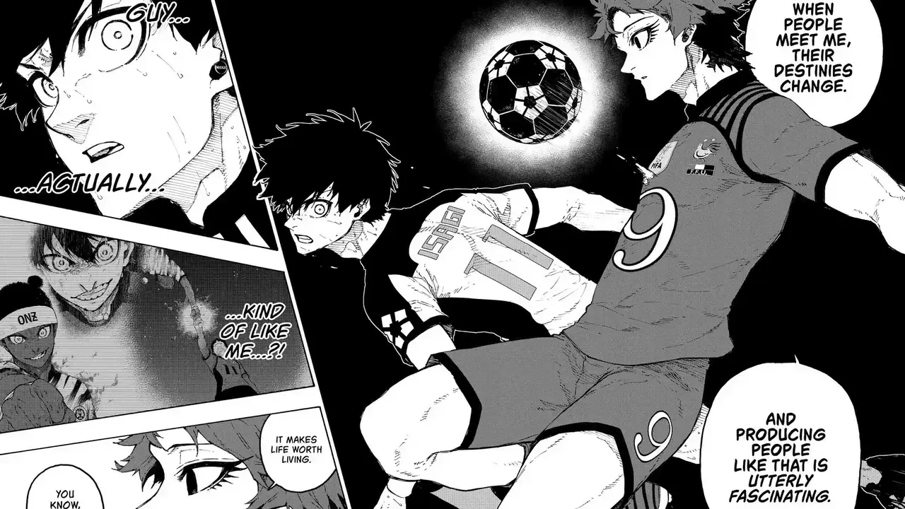 Hugo begins telling Isagi about his ego as the second best. Loki passes him the ball, and as he starts running with it, he says that Isagi probably thinks being second best means someone who couldn’t manage to become the best. But that’s not it. The Blue Lock players have just been brainwashed by Jinpachi Ego to believe they have to be the best. Isagi tells him to shut up because he doesn’t want to hear his biased opinions. But Hugo says that Isagi is the one who’s biased and asks if he ever looked at someone and thought they were wasting their talents. Suddenly, Isagi is reminded of Hiori, Barou, and Kenyu, who he thought were not living up to their potential.