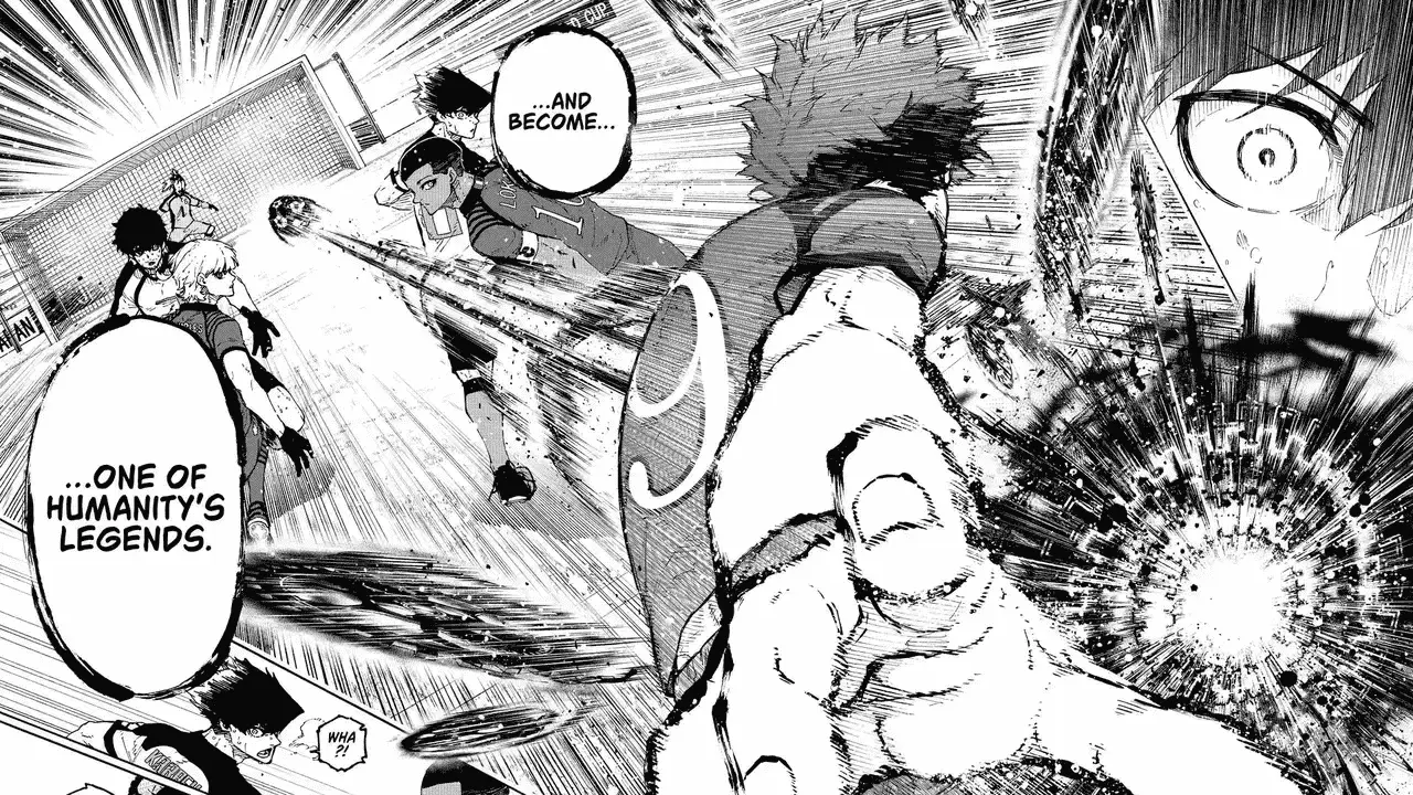 The record of winning the football World Cup most times belongs to the Brazilian legend Pelé, who won it three times. As Hugo mentions this, we see Loki and Charles coming in from the sides, and Blue Lock players rush to them to stop any passes. But Hugo is not looking to pass. He tells Isagi that he will break Pelé’s record and win the World Cup four times, becoming one of humanity’s legends. In a swift shot, he cuts through the field and scores a beautiful goal. Japan’s players realise that he created all the pass courses as mere decoys so he can get a straight shot.