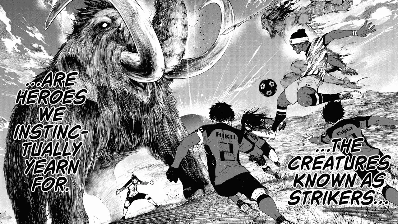 Rin is stopped by the Nigerian player Obo, who deftly passes the ball to Bello, who tries to get a goal himself instead of passing to Onazi. He dodges Karasu, but the Japanese defender easily catches up with him. In panic, Bello passes to Sadiq, who is cornered by both Chigiri and Reo. Ego likens football to a group hunting where a team chases down their prey and finishes it off together. Sadiq kicks the ball to Onazi, who jumps up in the sky to receive it. Ego says that in this group hunting, the striker is the person who fearlessly leads the charge and lands the final blow on the enemy. That’s why, everyone instinctively yearns for these heroes known as strikers.