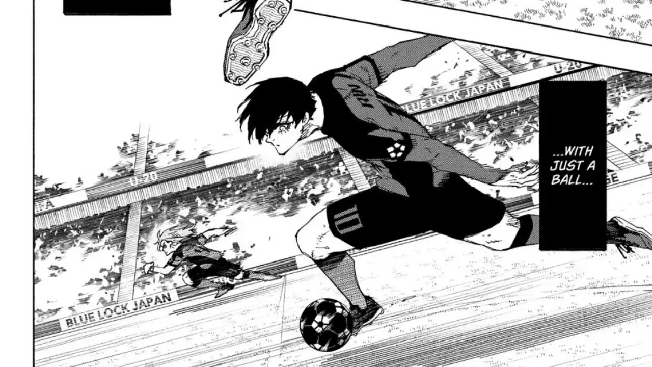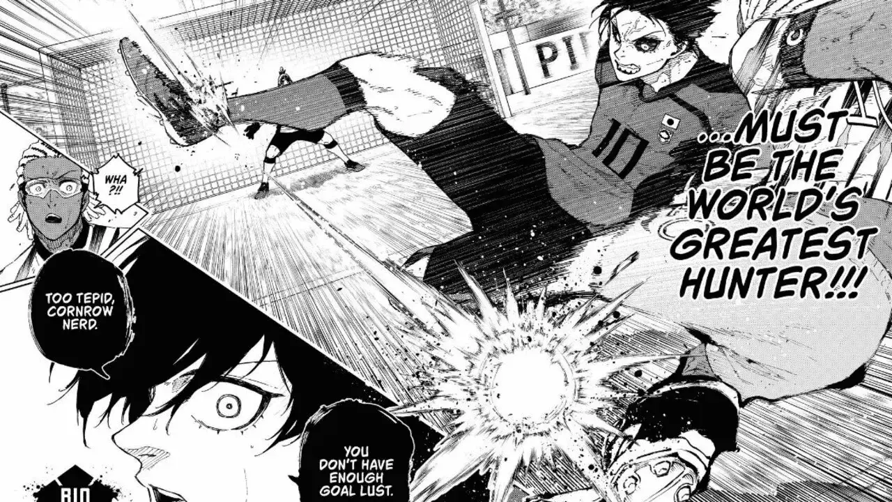 The match begins again, and Rin runs up with the ball. In between the game panels, we see Ego talking about football. He says that the reason why football is so famous is not just because despite their backgrounds, anyone in the world can dominate a field with just a ball. But the reason behind its fame is far more primitive. The origin of all sports lies in hunting, something our ancestors used to do. Cave paintings suggest that sports like martial arts and throwing stones and spears originated from the need to acquire prey. In simpler words, much like how hunting fills empty stomachs, sports satisfy the hunger in people’s souls, and that’s why everyone is so entranced by it.