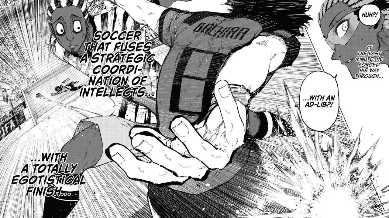 A Nigerian player wonders which Bachira will pass to. But the player uses his incredible dribbling to pass the ball to himself in a forward-launching arc. Before the Nigerian defender can stop him, Bachira breaks through the penalty box and scores a phenomenal goal, putting Japan ahead of Nigeria. Isagi compliments Bachira, who says he’s gonna scatter his Ego all over the field.