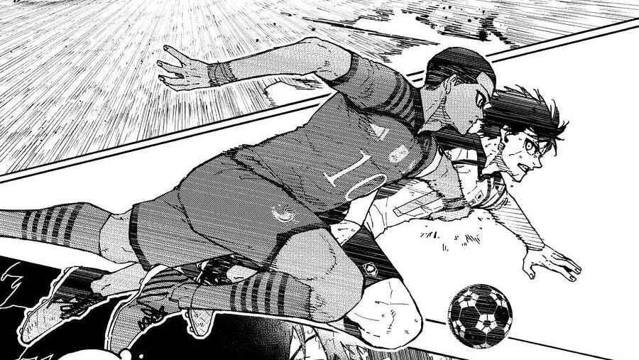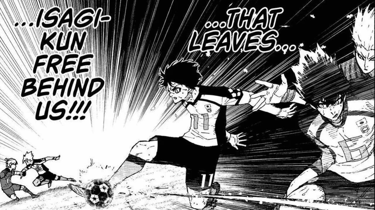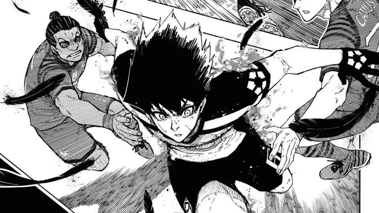 The chapter opens with the second half kick-off. Japan is immediately on attack mode, with Tabito Karasu kicking the ball at Shidou, who deftly reflects it to Reo. Reo again passes the ball to Karasu who starts running up with it. France realises that Blue Lock is using a new triangular attack pattern to bypass their defense, and Karasu is at the crux of it. Shidou gets the ball again and passes to Hiori, who is the second crux of this pattern. As soon as he gets the ball, all the players start moving towards the goal.