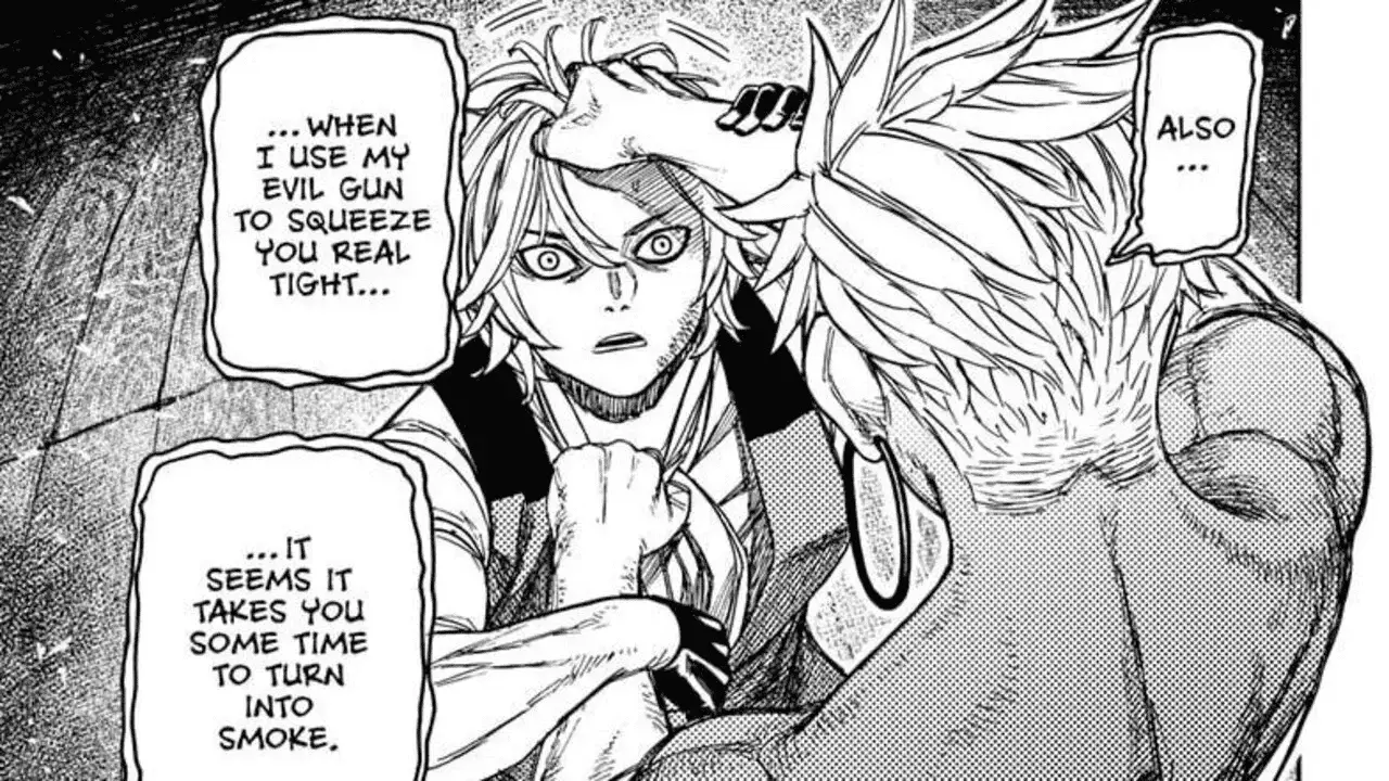 In the previous chapter of Yukinobu Tatsu’s manga, Jiji and Evil Eye combined their powers to take a new form. To bypass his Evil Gun power, Saint Germain uses his smoke transformation ability to enter Jiji’s lungs. However, thanks to Seiko’s training, the young boy has an effective method of ejecting unwanted influences from his body. In the end, he safely rescues Seiko with his determination and skill.