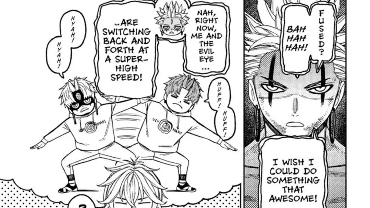 The issue begins with Jiji and Evil Eye’s new combined form. He looks at Saint Germain and says that he can defeat him now because he can use the Evil Gun and Evil Eye’s powers at the same time. Saint Germain asks if they have finally fused together, to which Jiji says that they can’t do anything that awesome yet. They’re merely switching back and forth at an incredibly high speed, something they practiced while playing video games. Much like how a light bulb appears to be constantly lit if the switch is turned off and on like at high speed, Jiji and Evil Eye merely appear to be fused.