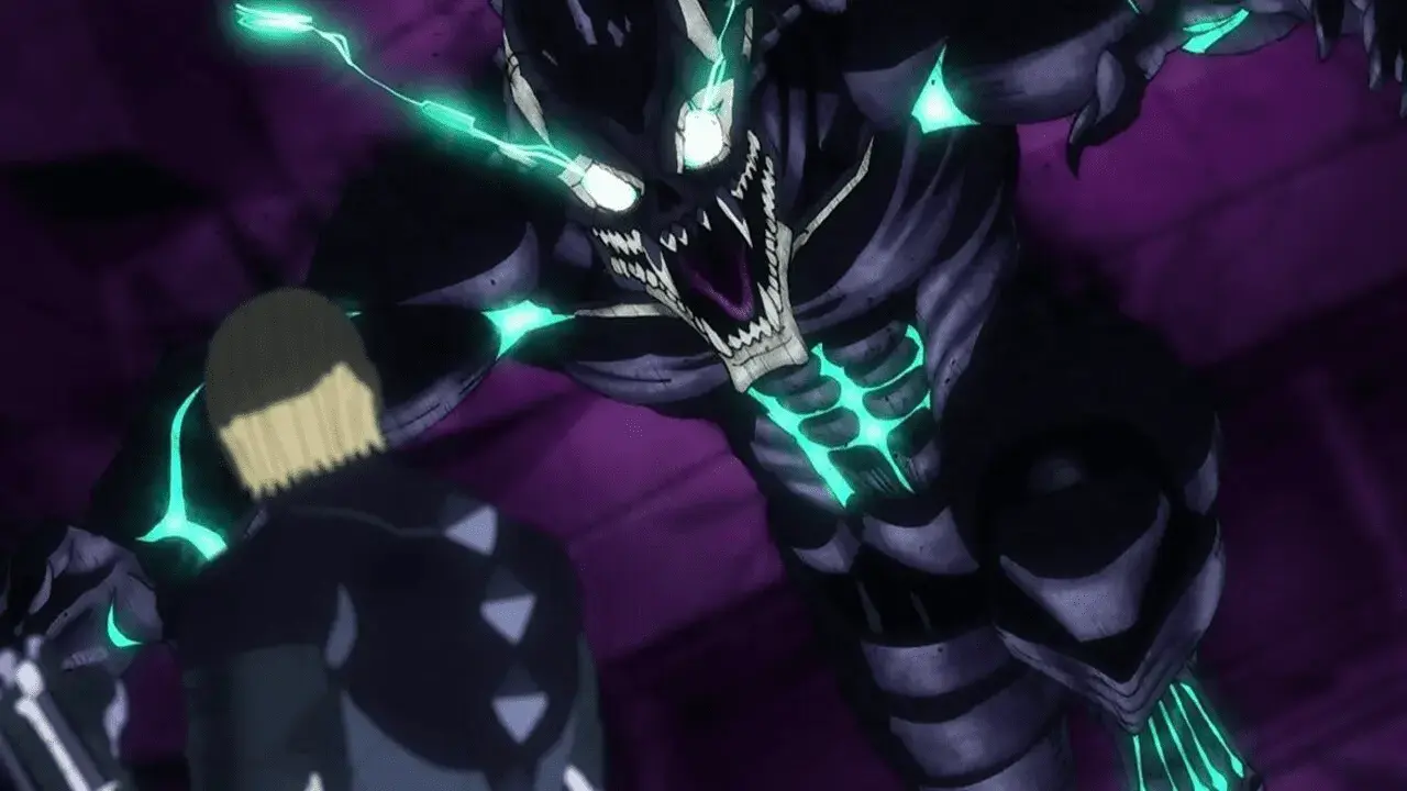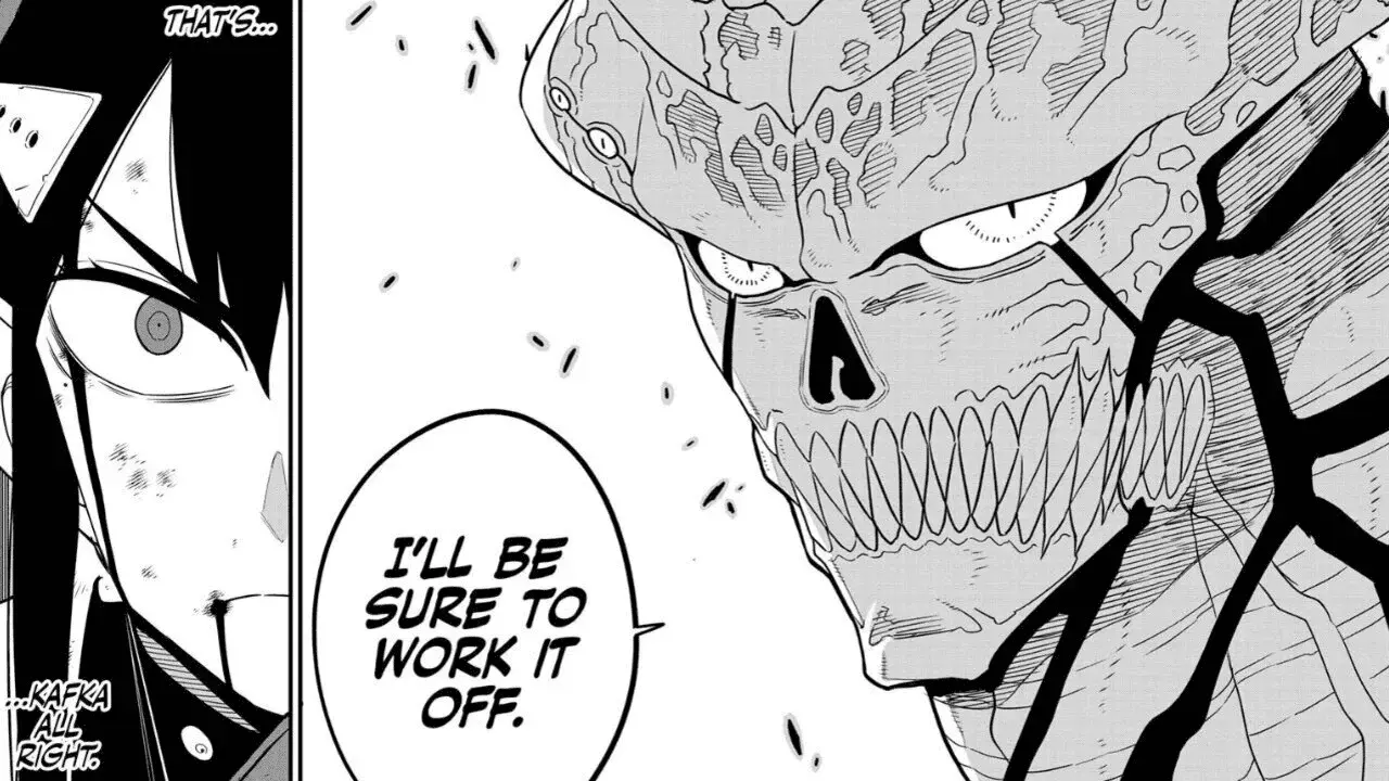 They wonder what this sudden change means. Kafka however, can feel all the anger, hopelessness, and resentment from the Meireki-era warriors emit from the ground and into his body and decides to use them as fuel. The Meireki-era monsters, who are all now in No. 9’s body, start laughing, which shocks everyone, and suddenly attack Kafka. The shockwaves from this destroy several buildings and push the protagonist back. However, Kafka tells the monster that there are too many people here and that they should fight in the Transmission tower. Right after, he lands a massive punch on Kaiju’s face and throws him back into another building.