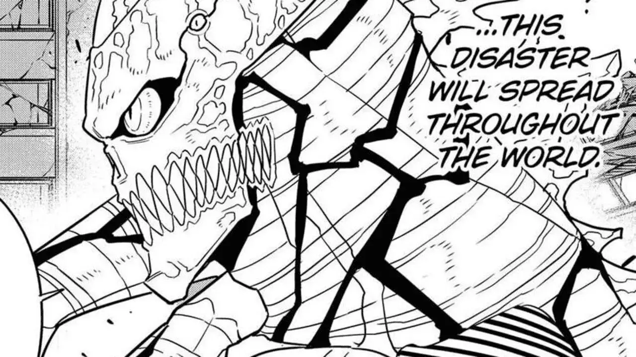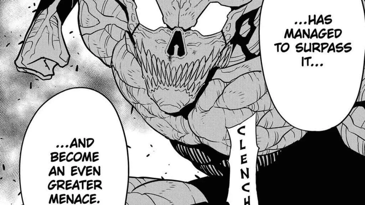 The chapter begins with Kafka realising that the ancient monster in front of him is even more powerful than it was 400 years ago. This is due to Kaiju No. 9’s added strength and intelligence. He promises to stop the disaster from spreading further and attacks the Daikaiju. However, the monster jumps upward and their clash causes a massive explosion. The enemy then slams Kafka into a building and prepares a beam attack, which is Kaiju No. 2’s specialty.