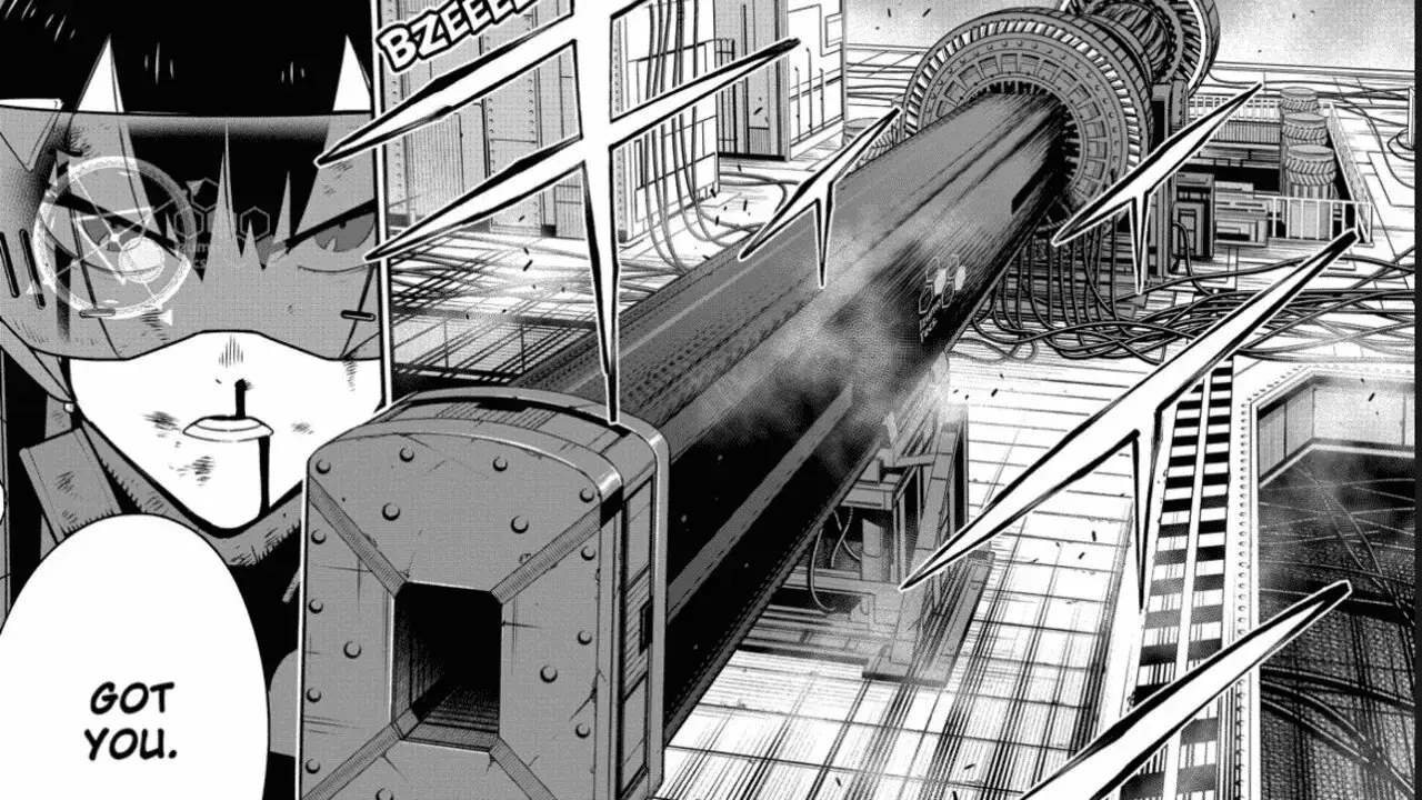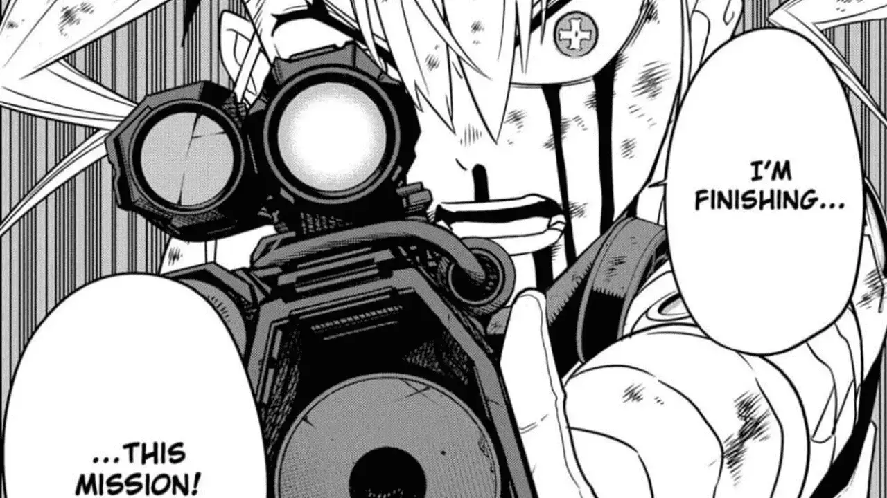 The Daikaiju raises a hand to attack Kikoru, and she can’t increase her output to evade it. Her power output drops another few levels and Kafka tries to help her. But Kikoru screams at him to stay back, saying she’s done being rescued. She resumes the mission, hitting the target with her weapon and driving the daikaiju towards the designated spot. She promises to surpass everyone, including Captain Narumi, her mother, and her father and become the strongest Defense Force officer. Kafka helps her by punching the Daikaiju and Okonogi announces that they’ve reached the target point. The final panel shows Mina Ashiro ‘locked on’ with her massive weapon Keraunos, ready to bring down the monster’s shield.
