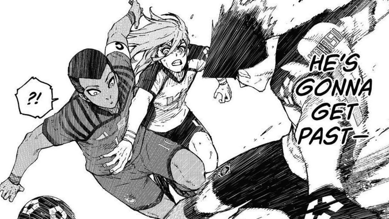 The chapter begins with the French goalkeeper Renoir making a long throw towards Loki, who starts running towards Japan's goalpost with the ball. On the sidelines, Anri asks Jinpachi Ego what they should do since none of their plans are working against France, but Ego stays quiet. Loki starts to run at full speed, and it seems nobody can catch up to him. But Blue Lock’s own speedmaster, Chigiri, runs up behind France’s ace and tries to stop him. Chigiri soon realises that not only is Loki fast, but he can also push through players due to his great strength.