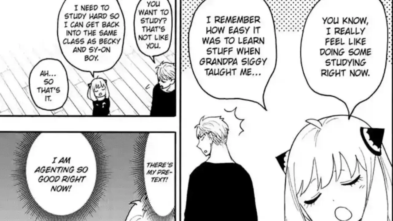 The chapter opens with Yor leaving to have dinner with her co-workers who wanted to apologise for accusing her of cheating. Loid thinks about how the notebook from Melinda she gave him provided him with some amazing details. Anya reads his mind and panics because she doesn’t want to be left behind. Loid again thinks how Professor Authen must have been involved in Donovan’s businesses but doesn’t know how to approach the elderly man about it. Anya suddenly suggests about getting tutoring sessions from ‘Grandpa Siggy’ (Professor Sigmund Authen) again so she can get back to the same class as Becky and Damian.