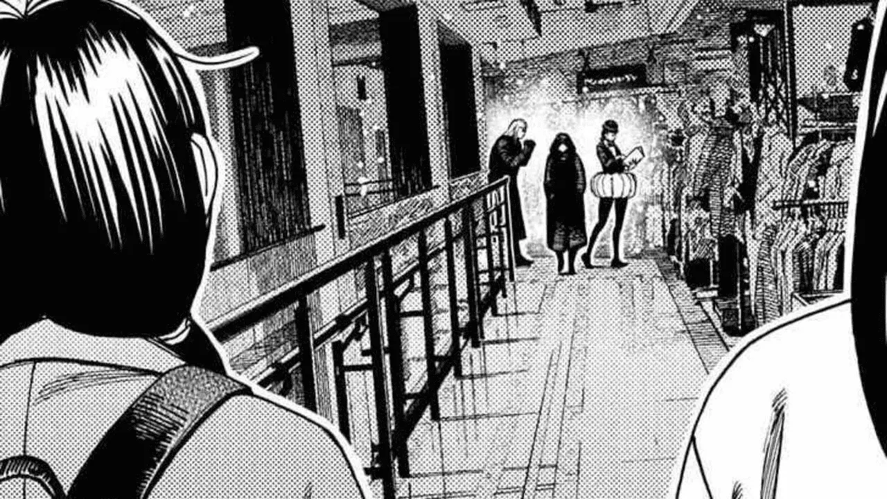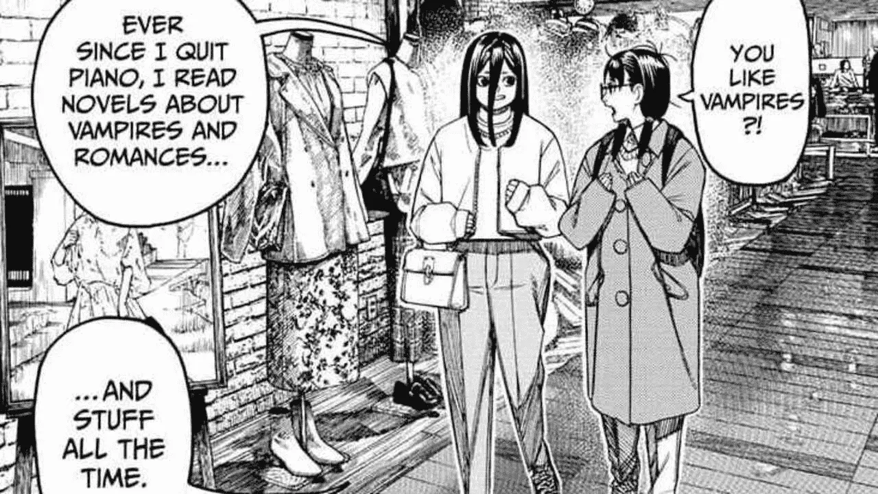 The next panel shows a mall, where Kouki and Rin seem to be spending time together. Rin starts excitedly talking about vampire media after learning that Kouki likes them too. The two start discussing their favourite types of vampires when suddenly, everything around them goes dark. The girls look around, confused, and spot three figures standing in the corner.