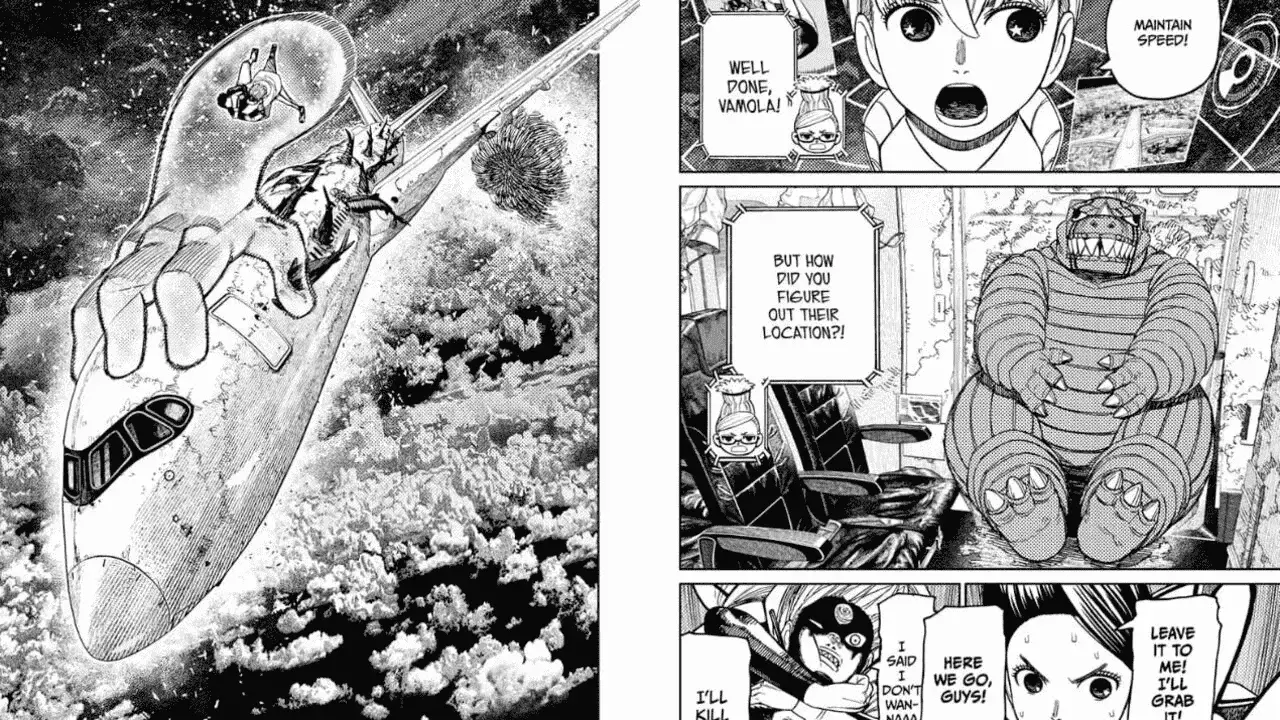 Daiki says that he wants to become a decent man like Zuma and Raiya, helping other people in need. And if Raiya or Zuma are in trouble, he wants to be the kind of man that would do anything to help. In the next panel, we see Seiko feeling dizzy as her body’s still extremely weak. Suddenly, Raiya carries Daiki into the cockpit. They explain that Daiki knows how to pilot a plane and Seiko gives up the controls to them. As the plane starts to turn around, we go back to the crew that’s flying on the back of the Death Worm. Momo asks the Naki Kito to fly them towards Shimane now that the Typhoon is defeated.