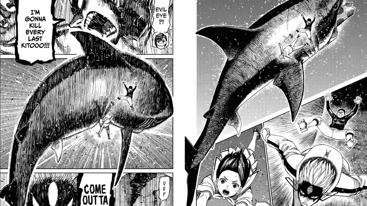 However, she says that the Kito family plans to take them to their hideout to make human sacrifices. Those two words trigger Evil Eye inside Jiji and the boy frantically tries to keep the Yokai at bay. But before they can do anything, the worm is swallowed by a massive shark that comes flying at them.