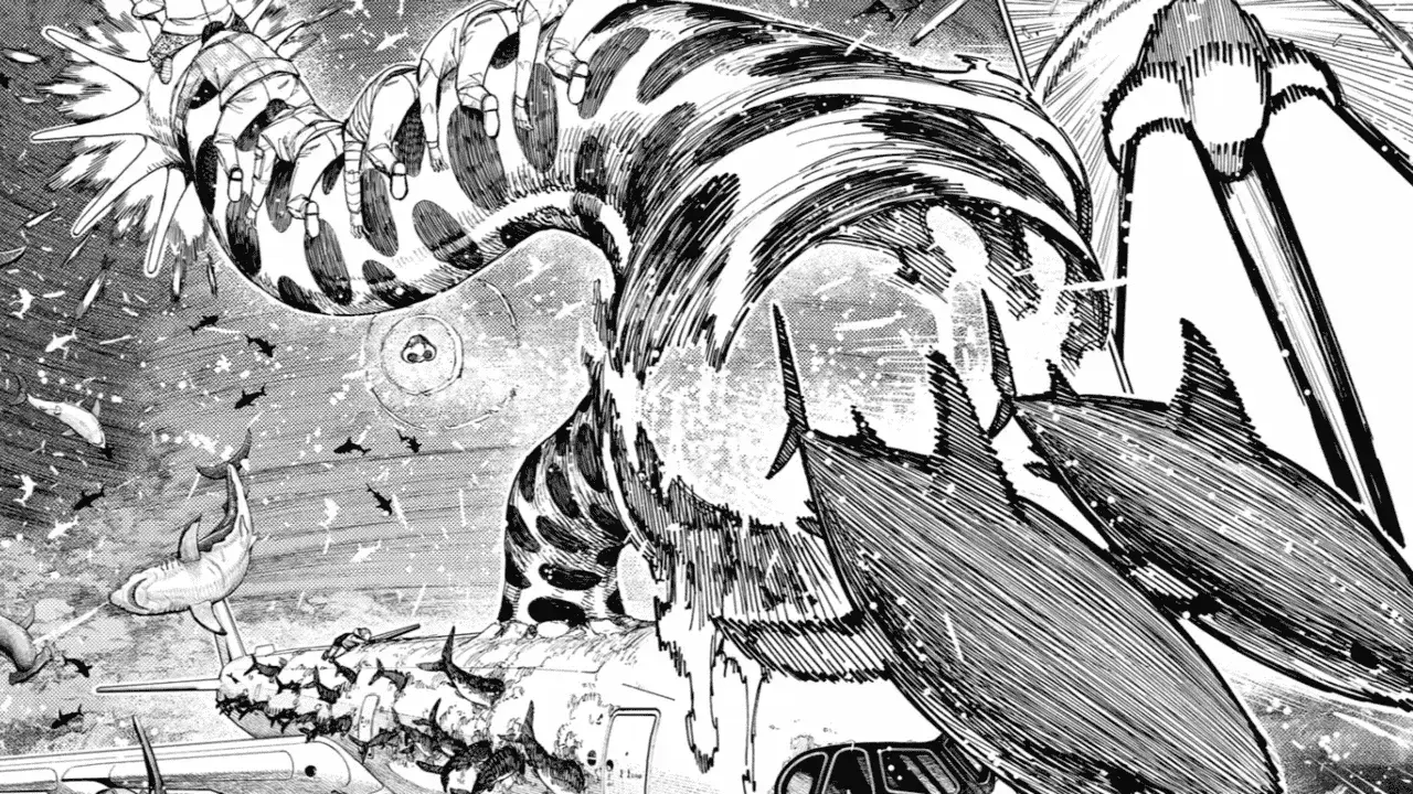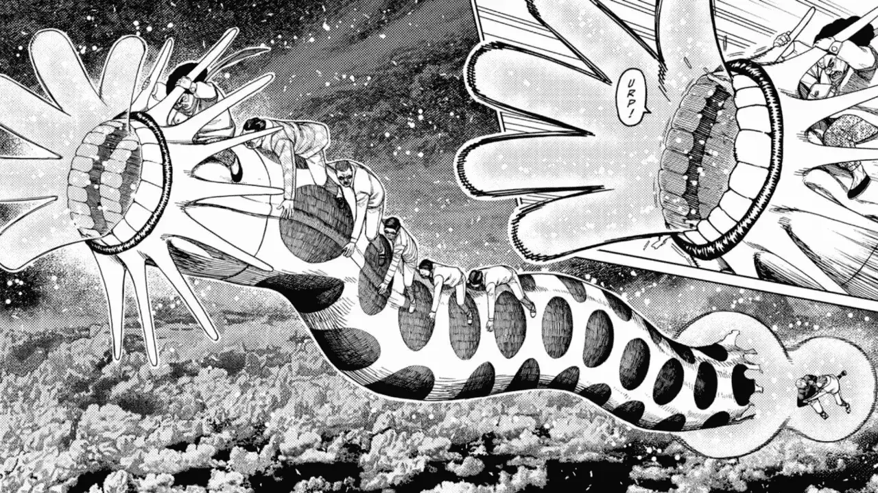 The latest chapter of Yukinobu Tatsu’s Dandadan manga was exactly what you’d expect after someone pulls out a dehydrated massive Death Worm from their purse. Things escalate pretty quickly as Momo flies out of the plane and Jiji and Zuma also come out to save her. Then our favourite protagonist uses her cool powers to control the severed worm to keep shooting frozen sharks at the Tornado Human.