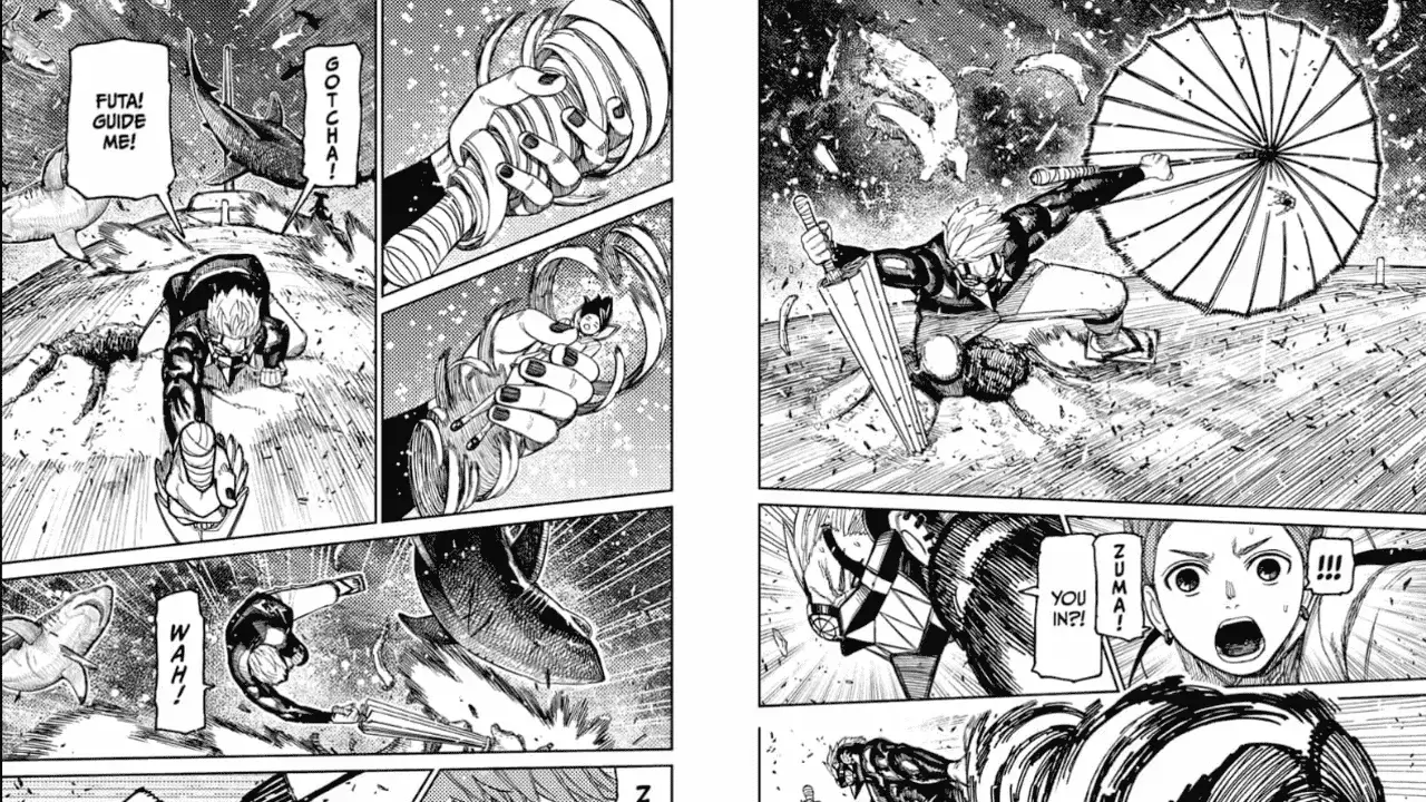 The issue begins with the Mongolian Death Worm flying around like crazy and shooting the frozen sharks into the center of the tornado. Momo and Jiji are shocked to see how well the Kito family is controlling it. They plan to continue their duty and use their powers to throw sharks, but suddenly, one of the sharks hits the plane, sending Momo flying out of a hole. Jiji jumps out of the plane, intending to catch Momo, but her tiny size makes it impossible for him to grab her. Suddenly, Zuma flies out of the plane and uses his Yokai power to catch Momo in one of his umbrellas. He then absorbs the umbrella back into his body, leaving Momo in his hand.