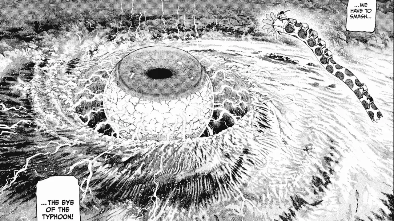 Momo then puts her psychic hand through the body of the worm, and out of the mouth. She starts piloting the massive worm that has the Kito family on it. With her, Jiji and Zuma are also hanging at the tail-end of the creature thanks to her powers. Momo explains that now that the worm’s like a tube, she can punch her power through it and the wind coming out of the bottom will cause it to fly like a kite. Jiji asks what she’s doing since they’re flying really far away from the plane. Momo says it’s okay and that they need to fly even farther up the stratosphere. She points out that they won’t reach Shimane if they don’t defeat the Typhoon Human. She flies upwards, until she can see the massive (literal) eye of the storm, and says they have to smash it to stop the typhoon.