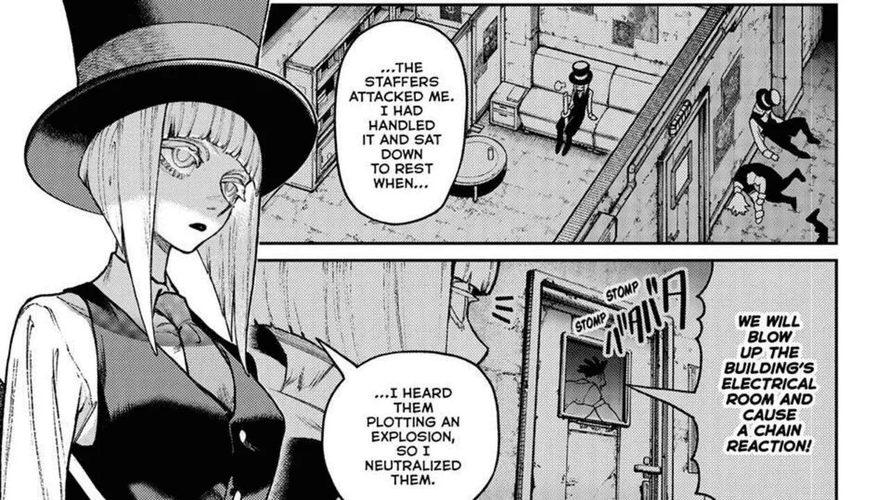 The issue opens with Wing thanking Hyo for taking care of the puppeted staff members. Hyo reveals that the staff attacked her when she came here so she knocked them out and took off their Chokers. Later, when she was sitting down to rest, she heard Gil and Felix talking about how there are bombs all across the venue and how they’re going to detonate them. Wing freaks out and says they need to find the bombs right away. However, Hyo is always one step ahead as she says that she has already taken care of them.