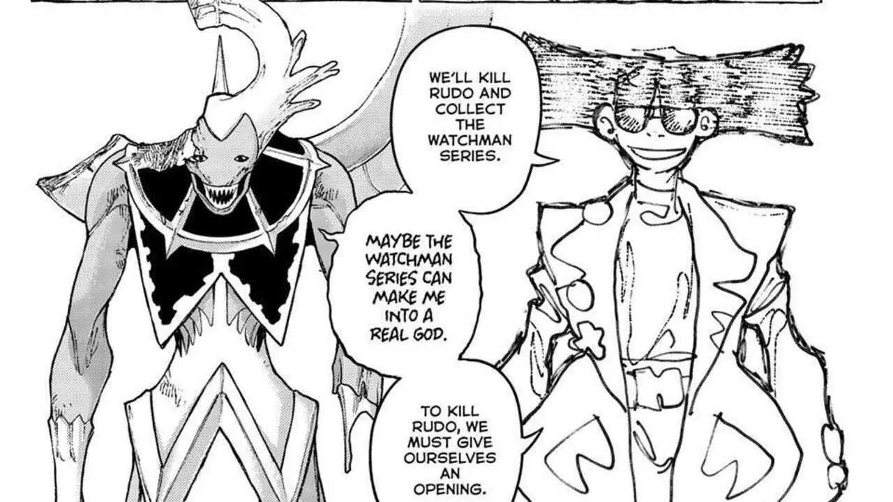 Human Mymo reminds monster Mymo that they know the location of all the Watchman Series Vital Instruments. If they can kill Rudo now and find all of them, there’s a chance for Mymo to become a real god, something unfathomable by human standards. To kill Rudo, they must find an opening, and to find that opening, they need to use Mymo’s speciality : words. In the final panel, we see Mymo’s monster form being pinned down by Rudo. He asks Rudo if he should tell him who killed Regto.