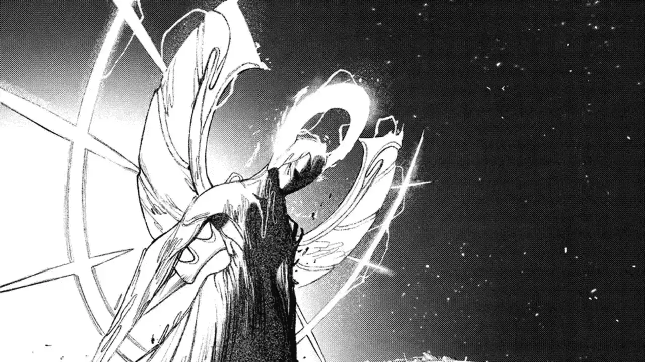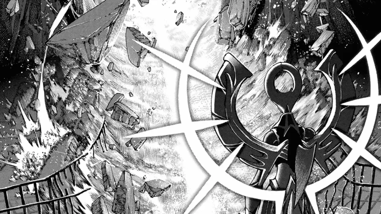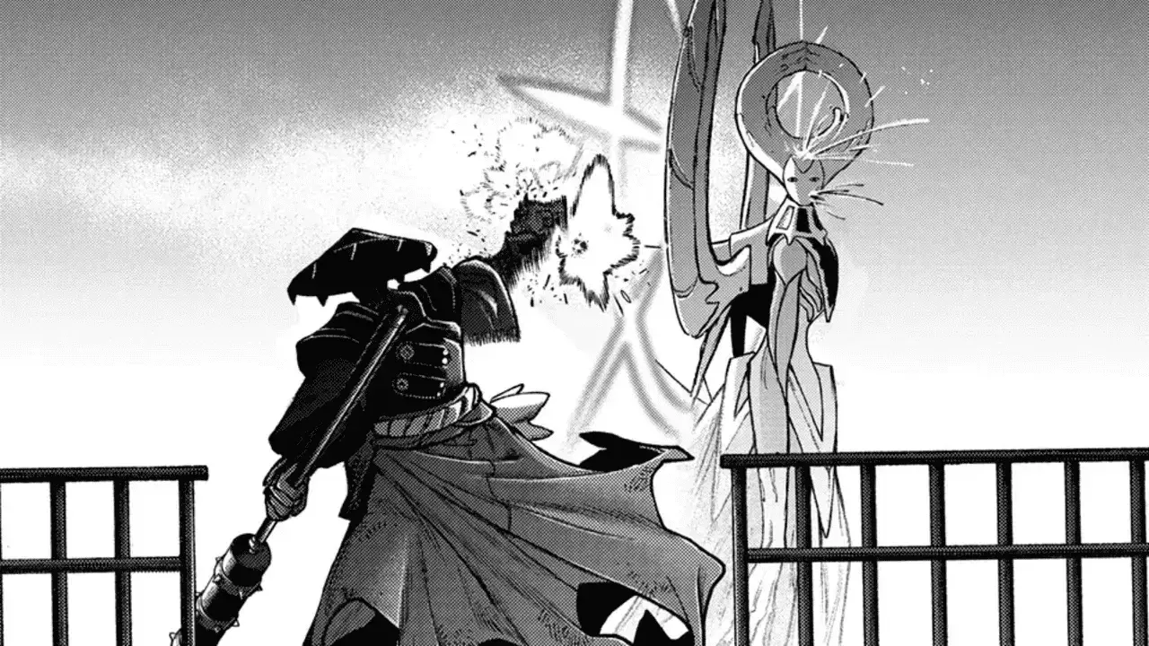 In chapter 152, we see everyone looking at the new creature in shock as it turns its head and looks around. Mildretta, who assumed Mymo’s Vital Instrument was destroyed because she shot it, feels guilty. But she soon recovers and fires a shot at this new being, which doesn’t seem to affect it much. The monster reaches a hand towards her, but Enjin rushes in to save her with his Umbreaker just in time. As the being flicks his hand, both of them break through the stadium walls and end up in rubble due to its sheer strength.