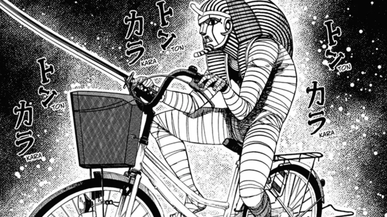 Okarun tells her not to do that because there’s no one around to help them and blowing on it will only cause her to lose her breath. Instead, he directs her towards Jiji’s place, as he might be able to help them. At the back, a Serpo alien calls the Mummy ‘Mr. Dris’ and asks why he’s going so slow. Instead of talking, the Mummy points his long sword forward. The white bandage on his body starts unravelling and he starts riding his bicycle on that singular strip.