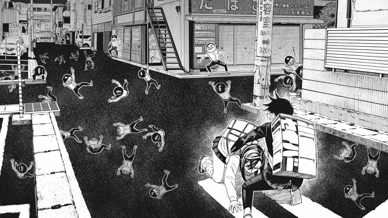 Momo realises that the Serpo aliens have surrounded them. But before she can do anything, suddenly, the floor from beneath her vanishes. Okarun catches her before she can fall and pulls her up. We realise that the asphalt part of the road has turned into a pit of darkness while only the white writings on the street can be used as solid ground. Momo and Okarun stand on one of these writings while the Serpo aliens start falling into the darkness around them, proving that they’re not impervious to this either. They realise that everything that’s not white has turned into a pit.