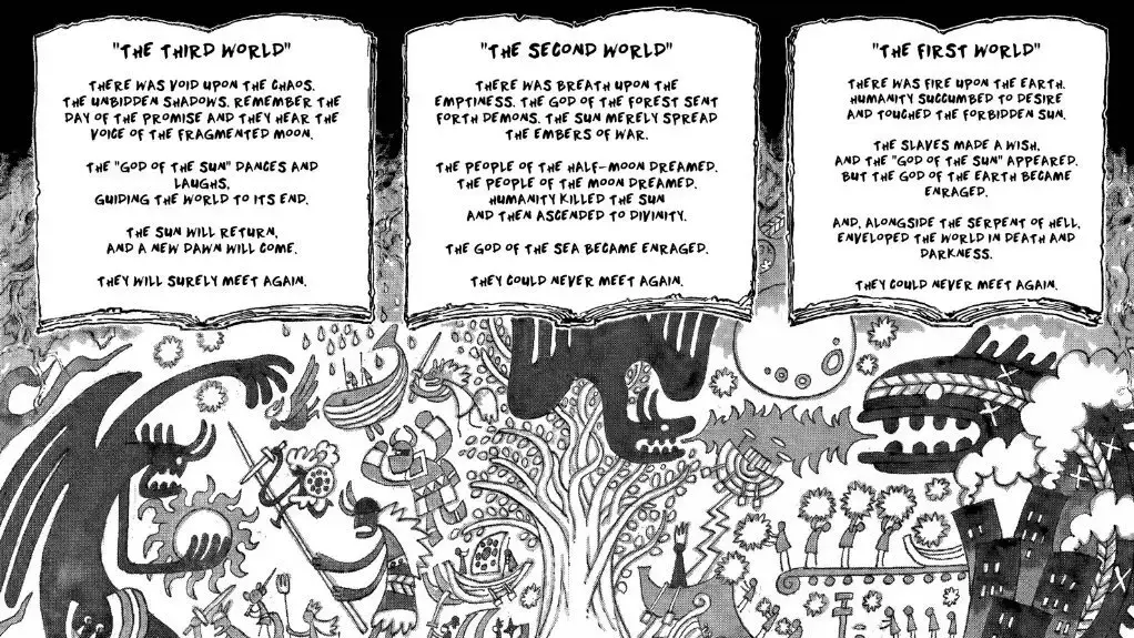 Just after this, we see Colon and the other children studying in the Walrus School. In the library, Saul hands the Harley text to Robin. He says that people have different interpretations of the text and that’s why there are so many versions of the Sun God Nika. He also says that the story of Harley is divided into three chapters, and the final chapter talks about the time that they’re living in now and about something that’ll happen in future. Robin starts reading what’s written in the book and Chopper listens. Elsewhere, Franky seems to be frozen looking at something. Here is what the three chapters of the Harley scripture read: